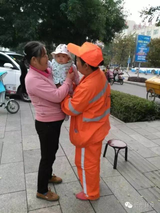(五)創(chuàng)衛(wèi)工作如火如荼,環(huán)衛(wèi)女工扔下嗷嗷待哺的女兒投身在創(chuàng)衛(wèi)工作。環(huán)衛(wèi)女工正在清掃路面垃圾,母親帶孩子來找她喂奶,孩子吃飽后,又把孩子交給母親,邊鏟除口香糖,邊望著遠(yuǎn)去的親人,滿臉的依依不舍。(董蘊(yùn)宜 攝)