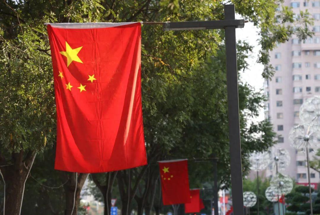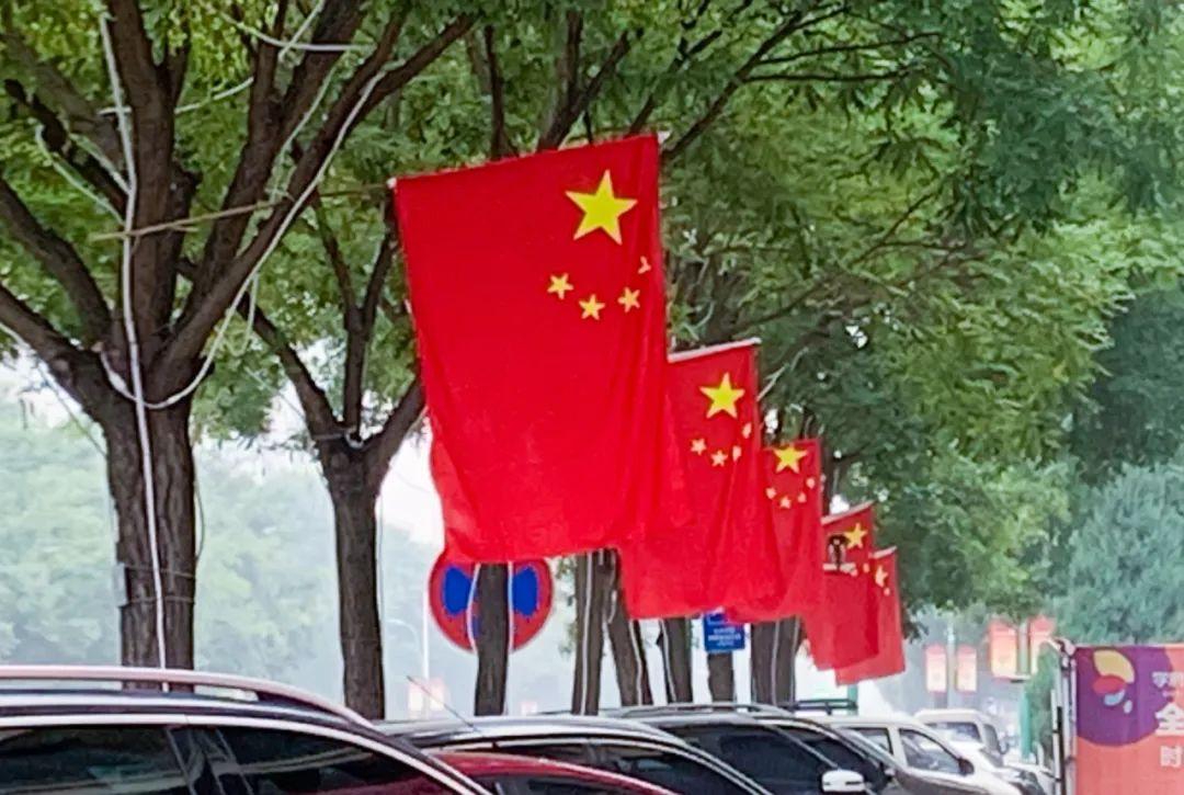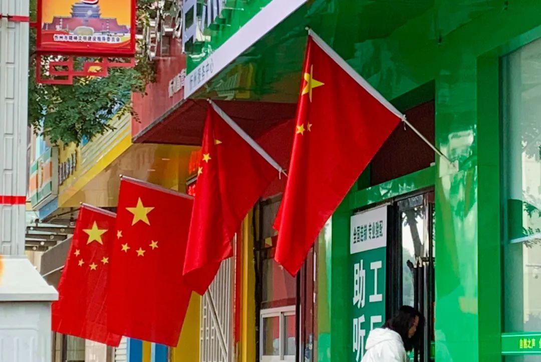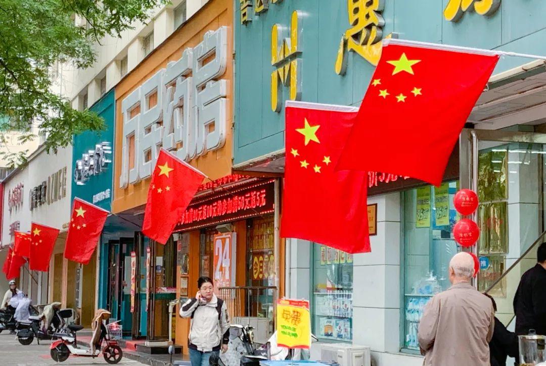 不少商鋪小店都懸掛出嶄新的五星紅旗
