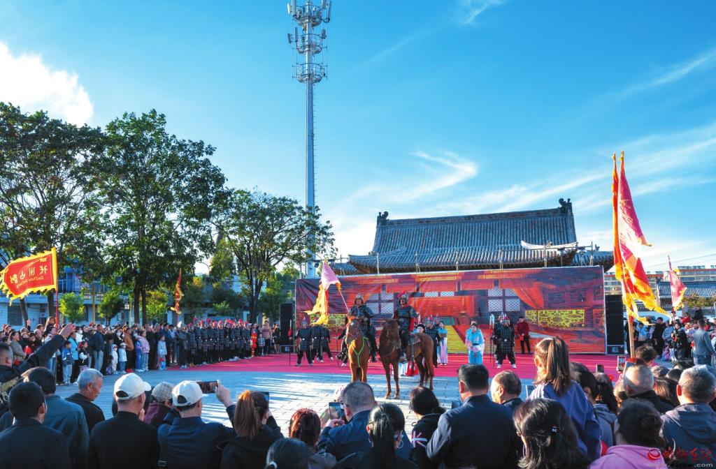 國(guó)慶假期,在代縣文昌祠廣場(chǎng),民俗展演和群眾慶?;顒?dòng)輪番上演,峨口撓閣和情景劇《天下歸心》等節(jié)目不時(shí)將演出推向高潮,既展現(xiàn)了代州古城的歷史厚重感,又呈現(xiàn)了當(dāng)?shù)刎S富的民俗文化,令人耳目一新。(王晉東攝)