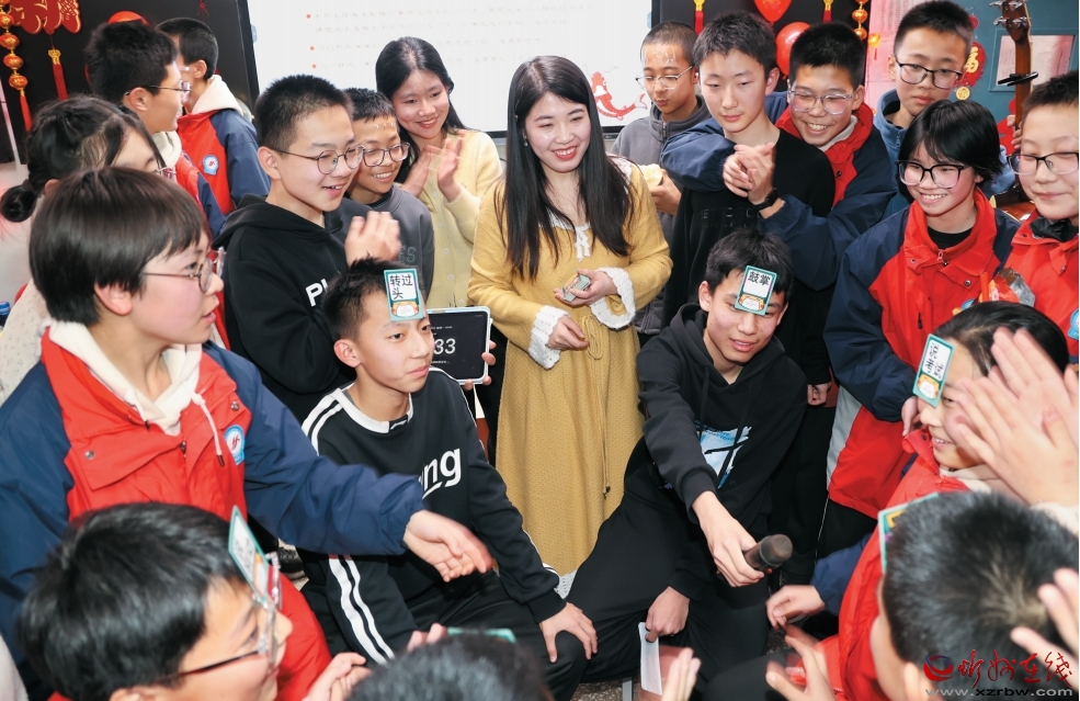 2024年12月30日,忻州師范學院附屬中學舉行班級元旦聯(lián)歡晚會,喜迎新年。圖為老師和孩子們一起做游戲。(記者 張存良攝)