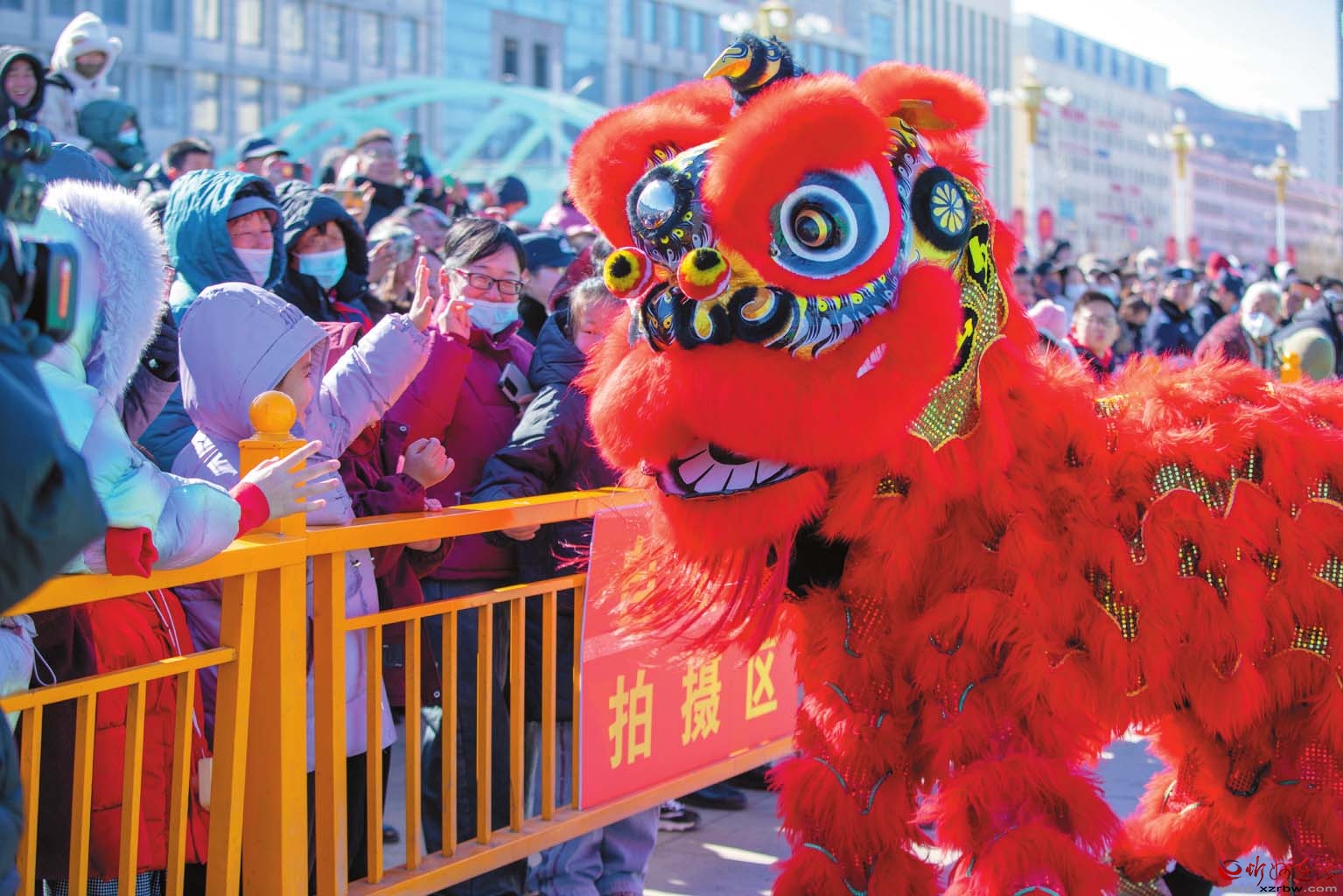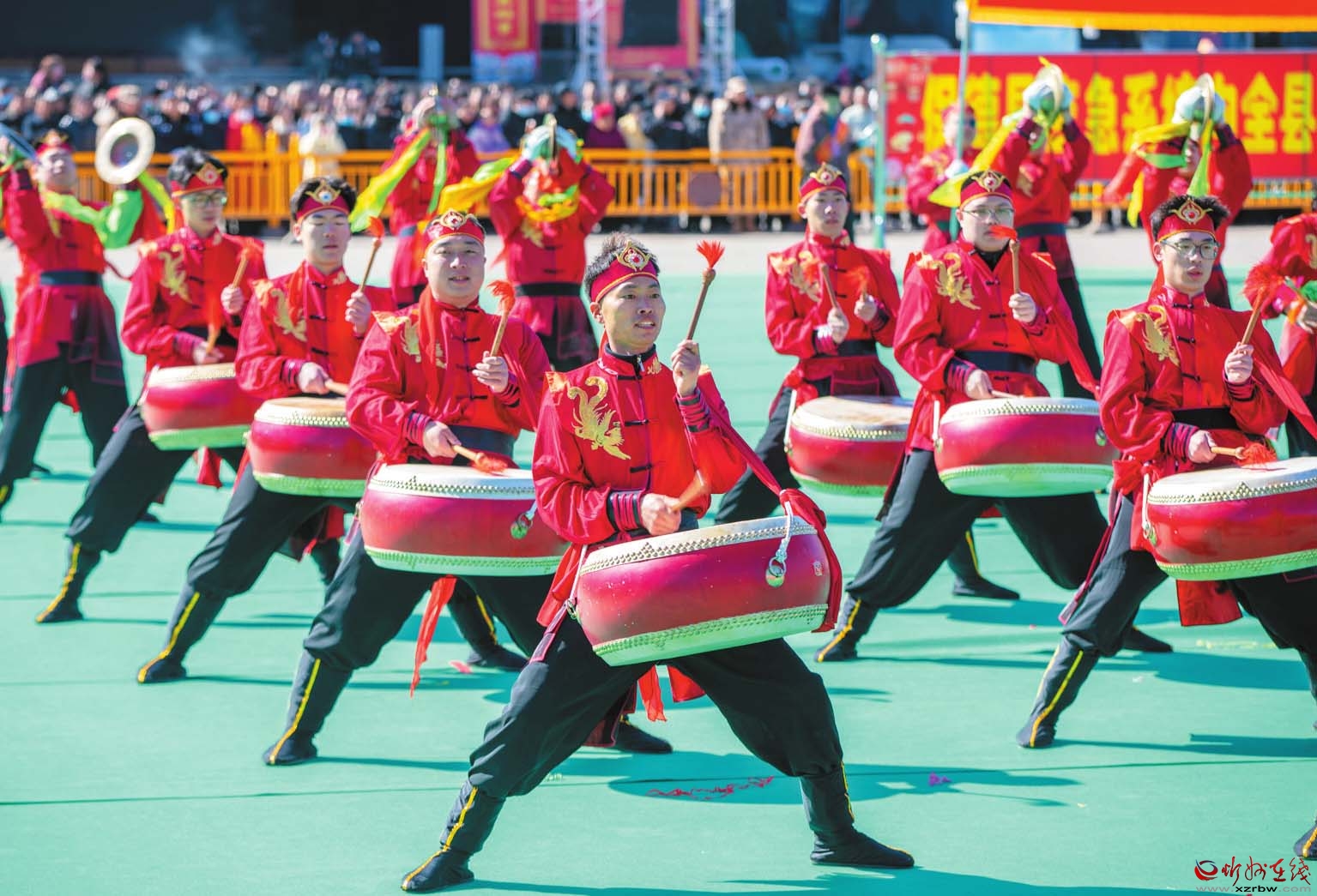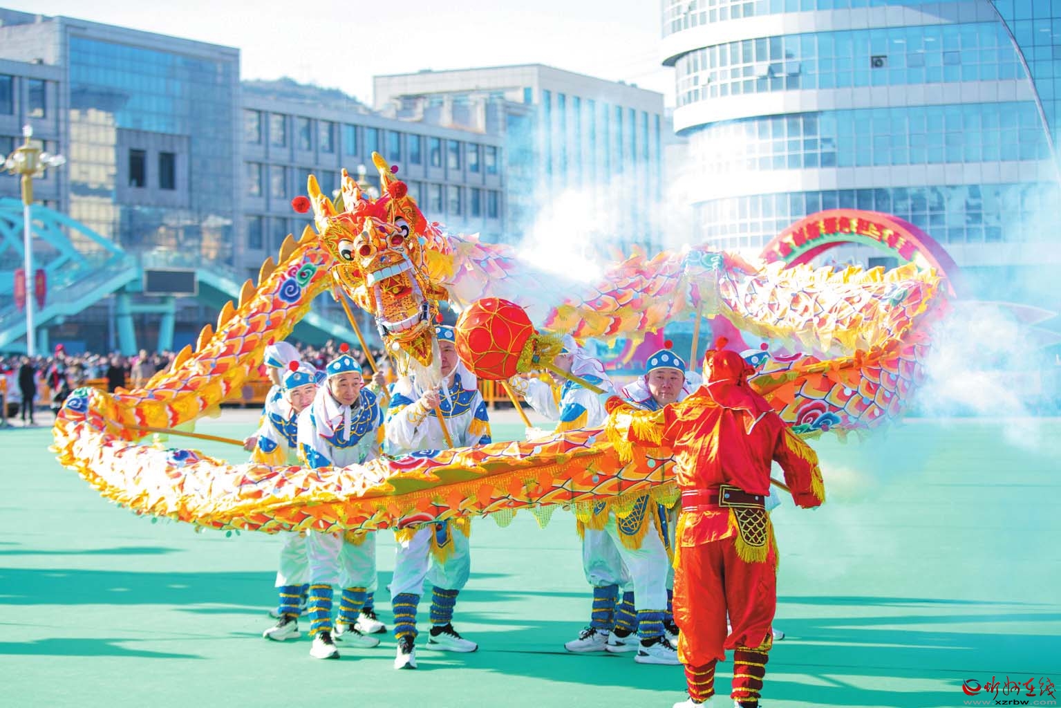 2月22日,縣城同舟廣場(chǎng)成為這場(chǎng)文化盛宴的中心舞臺(tái)。14支特色方陣、兩千余名參演者齊聚一堂,為全縣人民獻(xiàn)上了一場(chǎng)融合非遺精粹、民俗風(fēng)情與時(shí)代新韻的文化大餐。上午9時(shí),義門(mén)鎮(zhèn)的威風(fēng)鑼鼓隊(duì)率先擂響春雷般的鼓點(diǎn),拉開(kāi)展演序幕。隨后,保德大秧歌、黃河旱船、安塞腰鼓等節(jié)目輪番登場(chǎng)。金色巨龍騰空翻躍,舞獅表演靈動(dòng)威猛,秧歌隊(duì)伍歡快喜慶,將黃土地上的蓬勃生機(jī)展現(xiàn)得淋漓盡致。除了傳統(tǒng)民俗表演,教師方陣、軍樂(lè)隊(duì)、夕陽(yáng)紅文藝宣傳隊(duì)等也紛紛登場(chǎng),精彩的表演詮釋著保德人民對(duì)美好生活的追求。