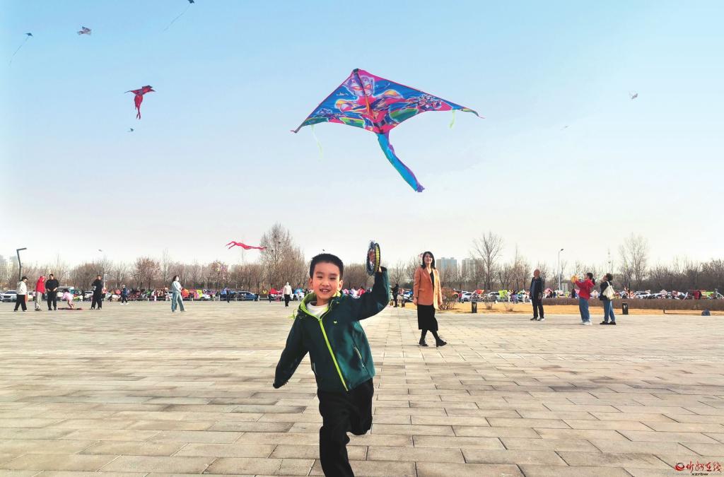春天來了,3月24日,小朋友在市五館一院廣場上放飛風箏,享受戶外運動的快樂。(宮清華 攝)
