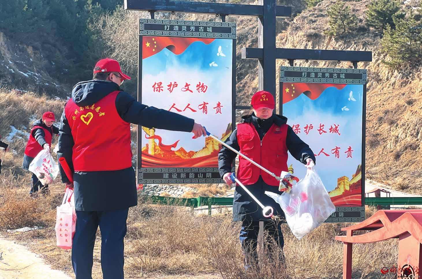 近日,山西交控忻州公司新廣武收費站的志愿者身著醒目的紅馬甲,來到廣武明長城開展志愿服務(wù)活動。圖為志愿者手持夾子等工具,認真撿拾垃圾。 (