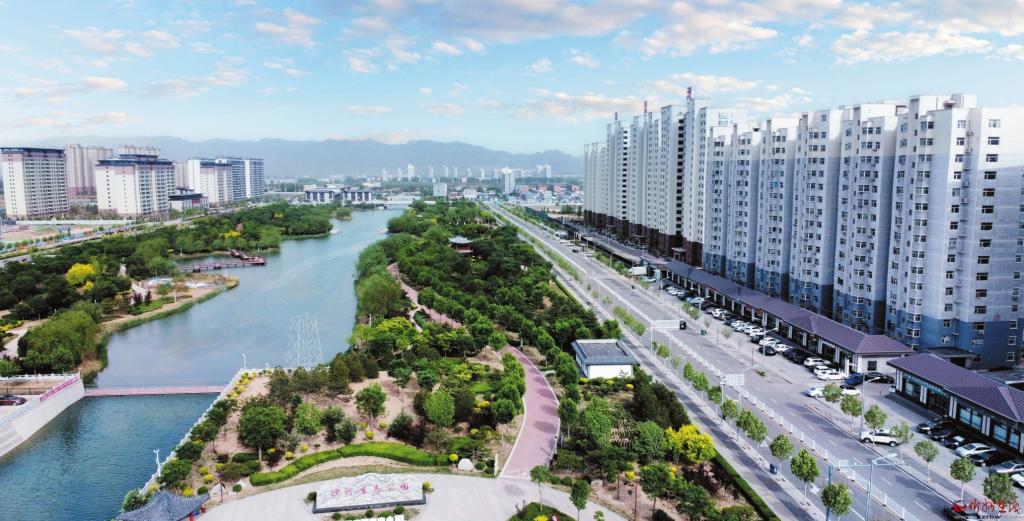 初夏時(shí)節(jié),原平城區(qū)沙河生態(tài)公園內(nèi)草木蔥蘢,與藍(lán)天白云、城市建筑構(gòu)成一幅水清、岸綠、景美的城市生態(tài)畫(huà)卷。圖為沙河生態(tài)公園一角。(褚震 攝)