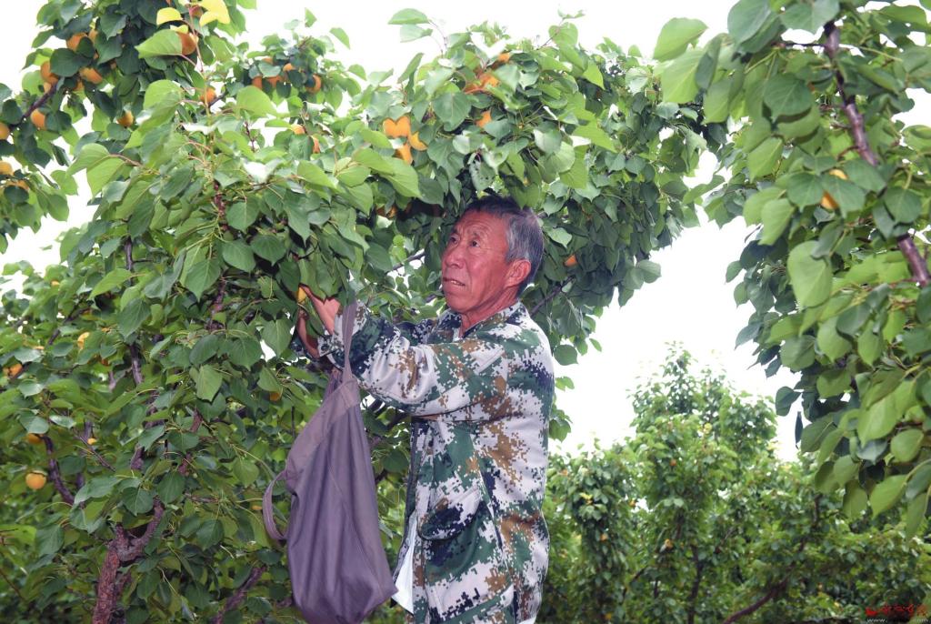 漫山杏黃綴枝頭。近日,定襄縣橫山村龍山莊園迎來杏子豐收季。金燦燦的杏果掛滿枝頭,果香四溢。果農穿梭林間,使用“采摘神器”摘取成熟的果實,臉上洋溢著豐收的喜悅。(郭彥蘭 攝)