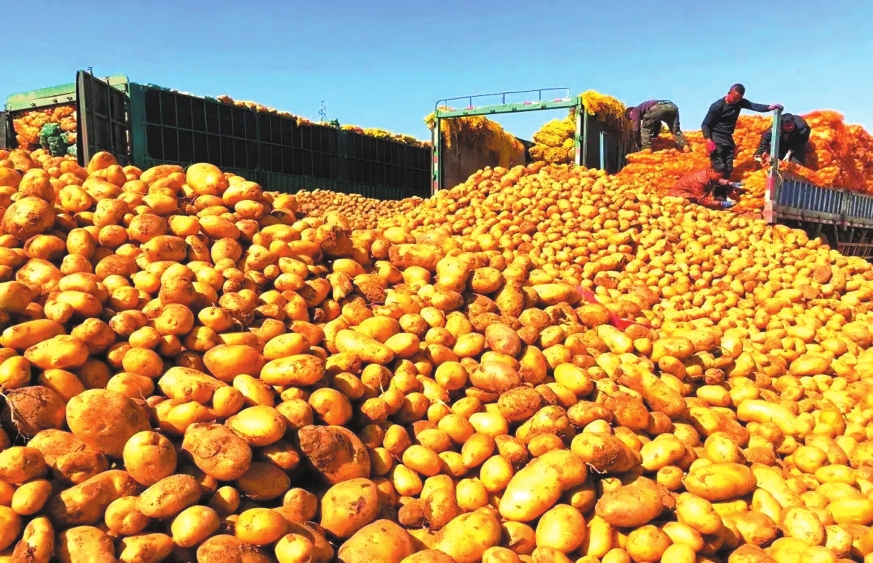 大田作物中,玉米貢獻(xiàn)了秋收“主色調(diào)”:玉米田穗大粒滿,金黃果穗綴滿秸稈,機(jī)械化收割設(shè)備穿梭田間。高粱與谷子在丘陵山區(qū)長(zhǎng)勢(shì)喜人,紅透的高粱穗與沉甸甸的谷穗隨風(fēng)搖曳。土豆則以“地下黃金”之姿獲得豐產(chǎn),圓整塊莖從土壤中翻出,分揀后裝車外運(yùn)。