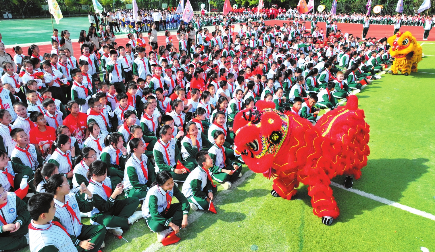 9月28日,忻州市長征小學(xué)西校區(qū)舉行第二屆秋季田徑運(yùn)動(dòng)會。圖為開幕式上孩子們與“獅”互動(dòng)。(記者 張存良攝)