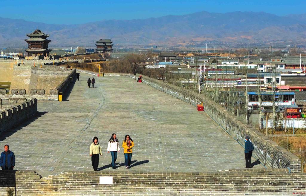 代州古城西城墻歷經(jīng)多年保護(hù)性修繕,是古城目前唯一修復(fù)完整并對(duì)外開放的城墻段落。圖為12月1日,游人登上西城墻游覽觀光。(王晉東攝)