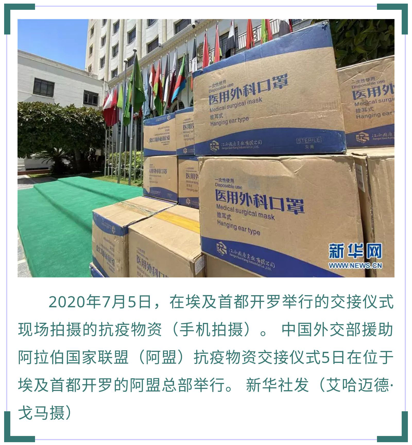 7月5日,中國外交部援助阿盟抗疫物資交接儀式在開羅舉行。中國駐埃及大使廖力強代表中國外交部向阿盟副秘書長胡薩姆·扎基移交了防護口罩。據(jù)廖力強介紹,新冠疫情暴發(fā)以來,中方向阿拉伯國家援助了大量物資,毫無保留地向阿拉伯國家分享抗疫經驗和技術,同21個阿拉伯國家舉辦了衛(wèi)生專家視頻會議,向8個阿拉伯國家派遣了醫(yī)療組,同時協(xié)助阿拉伯國家在中國采購抗疫物資,支持阿拉伯國家有序復工復產。