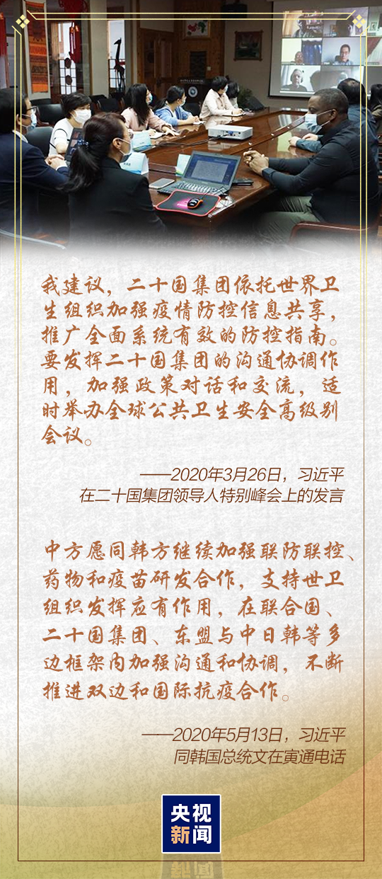 3月26日晚舉行的二十國(guó)集團(tuán)領(lǐng)導(dǎo)人特別峰會(huì)上,習(xí)近平主席宣布“同各國(guó)分享防控有益做法,開展藥物和疫苗聯(lián)合研發(fā)”“探討建立區(qū)域公共衛(wèi)生應(yīng)急聯(lián)絡(luò)機(jī)制”“加大向國(guó)際市場(chǎng)供應(yīng)原料藥、生活必需品、防疫物資等產(chǎn)品”……
