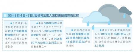 據(jù)氣象部門報(bào)告,預(yù)計(jì)8月4日-7日,我省將出現(xiàn)入汛以來(lái)最強(qiáng)降雨過(guò)程。為做好此次強(qiáng)降雨防范應(yīng)對(duì),8月3日下午,省防汛抗旱指揮部組織了緊急會(huì)商,進(jìn)一步強(qiáng)弱項(xiàng)、補(bǔ)短板,全力做好各項(xiàng)工作,確保安全度汛。