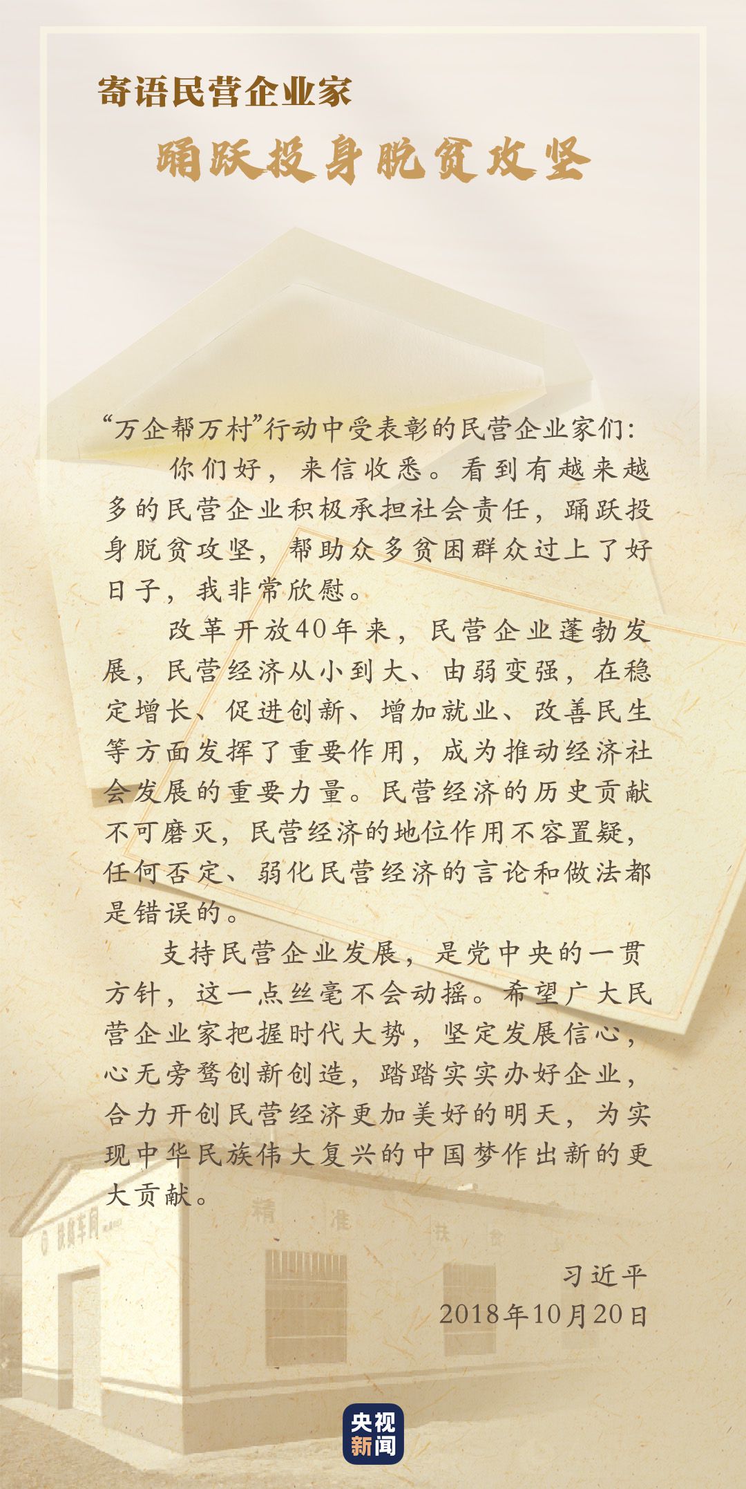 習(xí)近平對民營企業(yè)高度重視,給“萬企幫萬村”行動(dòng)中受表彰的民營企業(yè)家回信,對他們踴躍投身脫貧攻堅(jiān)予以肯定,勉勵(lì)廣大民營企業(yè)家堅(jiān)定發(fā)展信心,踏踏實(shí)實(shí)辦好企業(yè)。