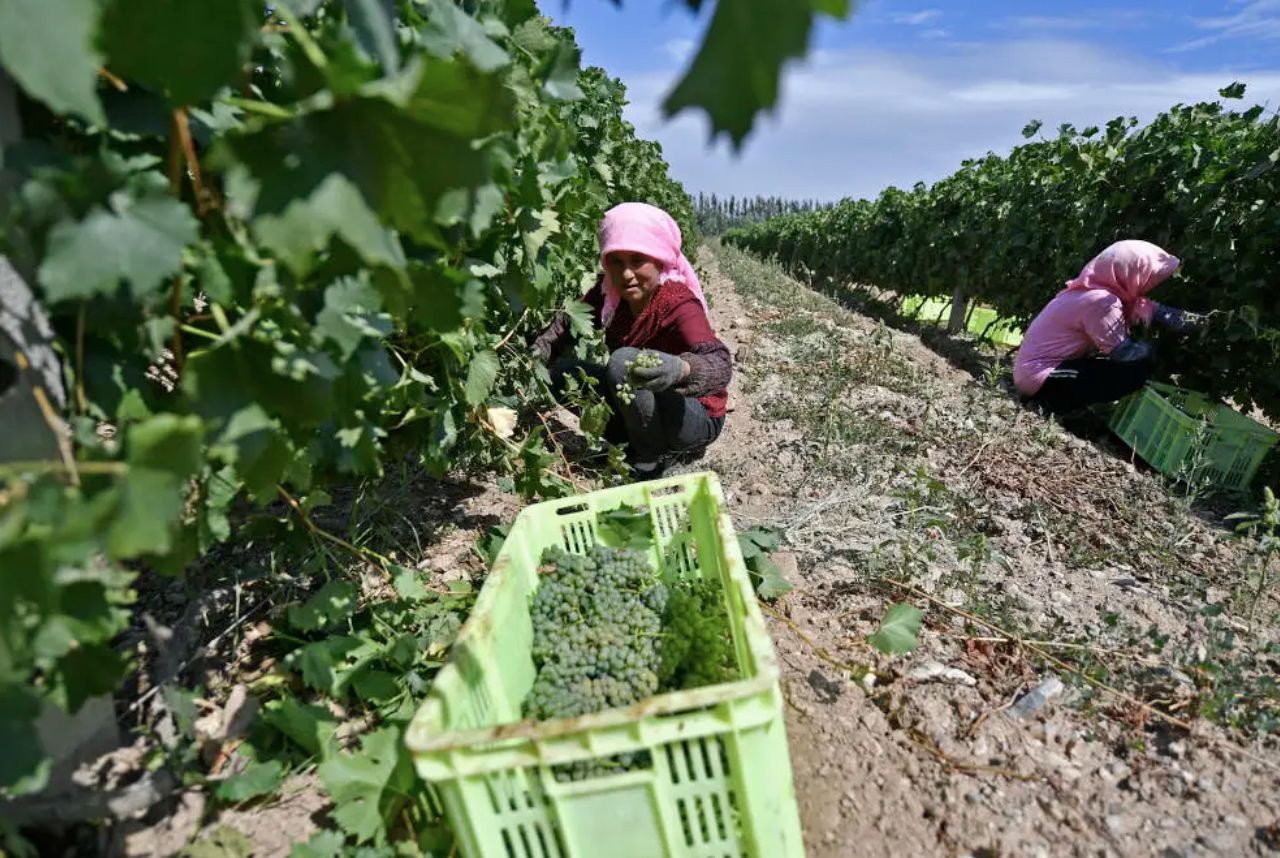 △寧夏銀川市永寧縣閩寧鎮(zhèn)原隆村立蘭釀酒葡萄種植基地,農(nóng)戶在田間采摘葡萄。