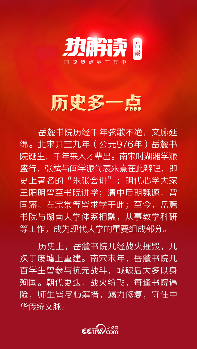 湖南大學岳麓書院外,習近平總書記深情祝福在場師生:“你們一定會不負時代的重托,繼續(xù)傳承湖湘之地這樣的一種精神,經(jīng)世致用,為中華民族偉大復(fù)興貢獻你們的所有才智。愿大家不負青春,不負韶華,形成成熟的人生觀、價值觀,走好人生的路,系好人生的第一顆紐扣?!爆F(xiàn)場掌聲經(jīng)久不息。
