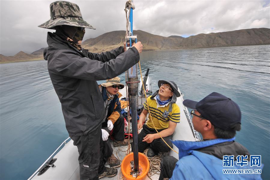 第二次青藏高原綜合科考的科考隊(duì)員在對(duì)羊卓雍錯(cuò)進(jìn)行深度測(cè)量,并標(biāo)記沉積物巖芯(2019年7月22日攝)。新華社記者 晉美多吉 攝