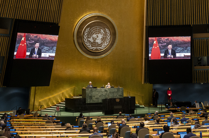 9月22日,國家主席習近平在第七十五屆聯(lián)合國大會一般性辯論上發(fā)表重要講話。新華社發(fā)(聯(lián)合國供圖/埃瑟金德爾·德貝貝 攝)