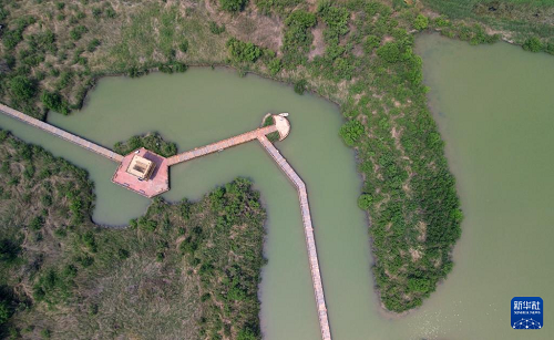 這是黃河三角洲國家級(jí)自然保護(hù)區(qū)內(nèi)的濕地(5月14日攝,無人機(jī)照片)。(新華社記者 徐速繪 攝)