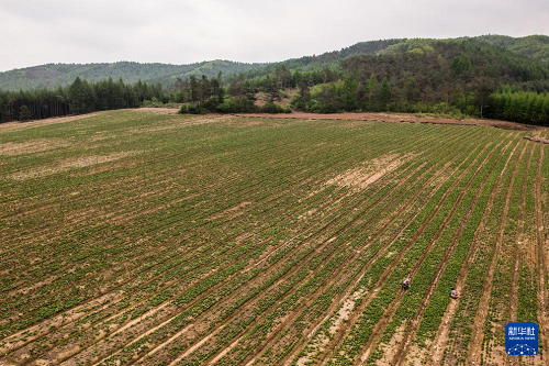 5月14日,在遼寧省撫順市新賓滿族自治縣,一家生產(chǎn)遼細辛企業(yè)的工作人員在種植基地進行日常維護工作(無人機照片)。(新華社記者 潘昱龍 攝)