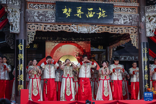 5月20日,新人們?cè)谥T暨市西施故里景區(qū)內(nèi)參加集體婚禮的拜天地儀式。(新華社記者 徐昱 攝)