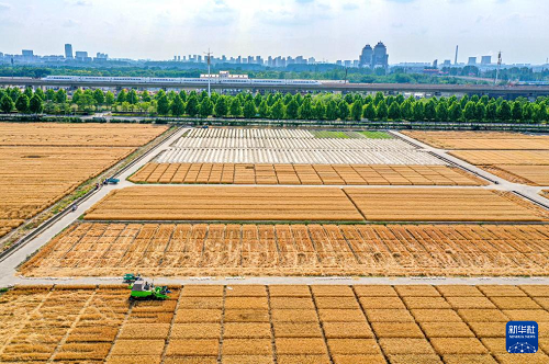 5月20日,在江蘇里下河地區(qū)農(nóng)科所(揚(yáng)州市農(nóng)科院)試驗(yàn)田,農(nóng)民駕駛收割機(jī)收割小麥(無(wú)人機(jī)照片)。(新華社發(fā) 任飛 攝)