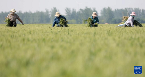 5月20日,河北省滄州市滄縣捷地回族鄉(xiāng)馬辛莊村的農(nóng)民進(jìn)行麥種提純作業(yè)。(新華社發(fā) 周洋 攝)