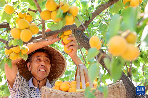5月20日,山東省棗莊市市中區(qū)齊村鎮(zhèn)鳳凰嶺村農(nóng)民在果園采摘鮮杏。(新華社發(fā) 孫中喆 攝)