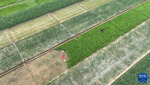5月21日,農(nóng)戶在河北省石家莊市藁城區(qū)常安鎮(zhèn)里莊村田地忙碌(無(wú)人機(jī)照片)。(新華社發(fā) 梁子棟 攝)