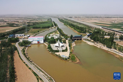 這是5月28日拍攝的巴彥淖爾市臨河區(qū)境內的總干渠第二分水樞紐(無人機照片)。(新華社記者 李志鵬 攝)