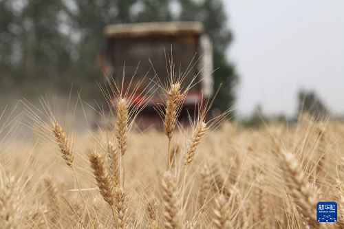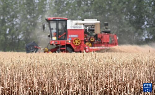 6月2日,農(nóng)機手駕駛聯(lián)合收割機在山東省聊城市茌平區(qū)賈寨鎮(zhèn)草林張村麥田里收割小麥。(新華社發(fā) 趙玉國 攝)