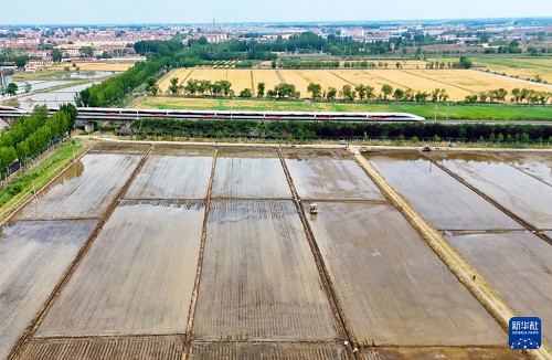 6月2日,列車從山東省青島市即墨區(qū)藍(lán)村街道青香水稻種植合作社的稻田旁駛過(無人機照片)。(新華社發(fā) 張進(jìn)剛 攝)