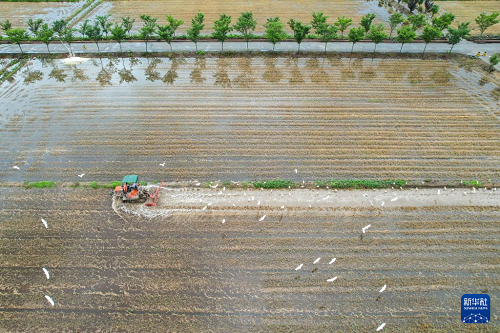 6月2日,浙江省湖州市德清縣乾元鎮(zhèn)村民駕駛犁田機械翻耕農(nóng)田,為栽插晚稻秧苗做準(zhǔn)備(無人機照片)。(新華社發(fā) 姚海翔 攝)