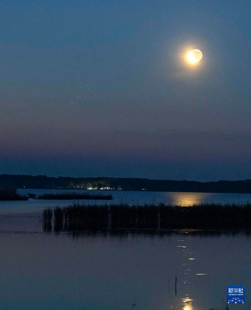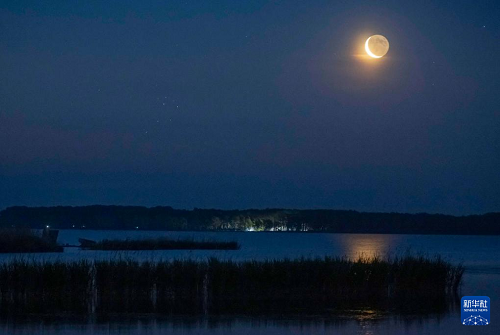 這是6月23日凌晨在黑龍江省齊齊哈爾市克欽湖拍攝的昴星團(tuán)伴月。(新華社發(fā) 王勇剛 攝)