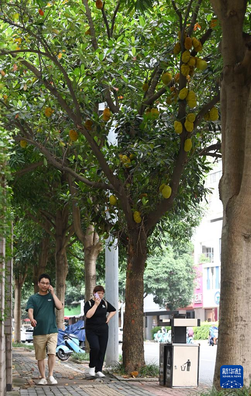 6月29日,在南寧市金浦路,市民從木菠蘿樹下經(jīng)過。(新華社記者 陸波岸 攝)