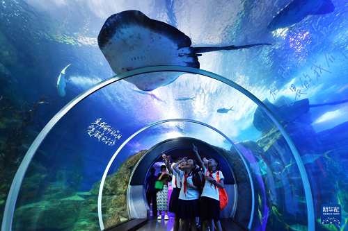 7月8日,山東省青島市市北區(qū)東勝路小學(xué)的孩子們在“海底隧道”參觀。(新華社發(fā) 王海濱 攝)