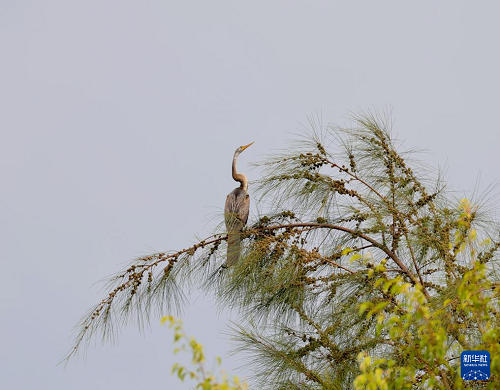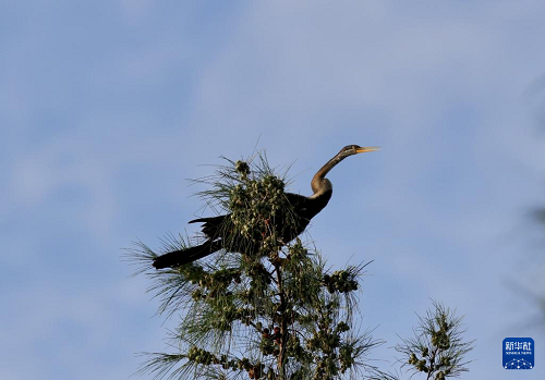 這是7月11日在海南昌江海尾國家濕地公園拍攝的黑腹蛇鵜。(新華社發(fā) 薛美麗 攝)