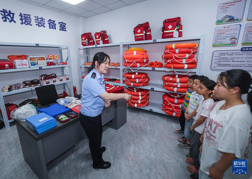 7月15日,在諸暨市安華鎮(zhèn)社會(huì)治理中心,安華鎮(zhèn)派出所民警為孩子們講解應(yīng)急救援裝備。(新華社記者 徐昱 攝)
