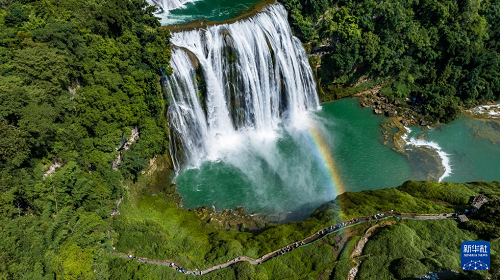 7月16日,游客在貴州省安順市黃果樹瀑布景區(qū)游覽(無人機(jī)照片)。(新華社記者 陶亮 攝)