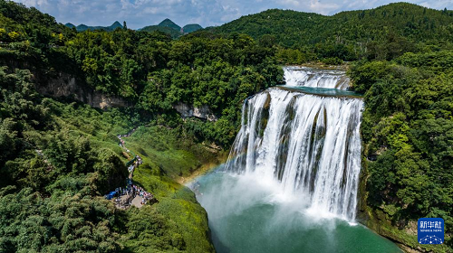 近日,位于貴州省安順市的黃果樹瀑布景區(qū)正處于夏日最佳觀賞期。黃果樹大瀑布水勢磅礴,在陽光的照射下,瀑布前架起一道彩虹,美麗的景象吸引各地游客前來觀賞游玩。
