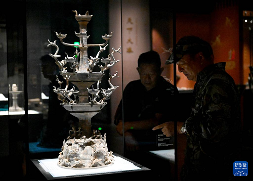 7月16日,參觀者在漢魏洛陽故城遺址博物館觀看展品陶百花燈。(新華社記者 郝源 攝)