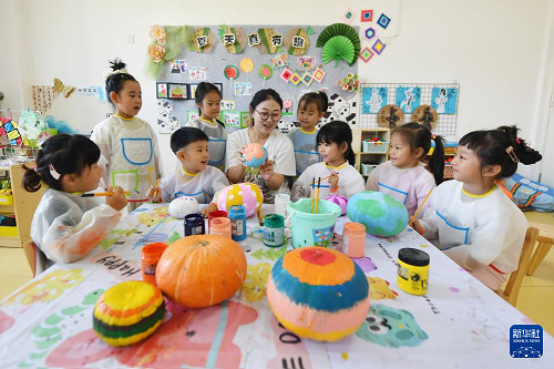 7月17日,在山東省青島市市北區(qū)第二實(shí)驗(yàn)幼兒園開展的“夏天真有趣”繪畫活動(dòng)中,老師指導(dǎo)小朋友彩繪南瓜創(chuàng)意畫。(新華社發(fā) 王海濱 攝) 暑假期間,孩子們參加豐富多彩的活動(dòng),樂享假期生活。 (責(zé)任編輯:蔡文斌) |