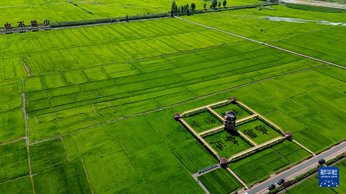 7月18日,游客在吉林省和龍市光東村的稻田觀光塔中游覽(無人機(jī)照片)。(新華社記者 邵澤東 攝)