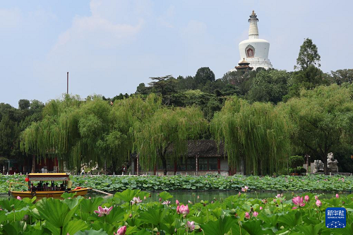 7月22日,北京北海公園盛開的荷花映襯著白塔。(新華社發(fā) 戴明軒 攝)