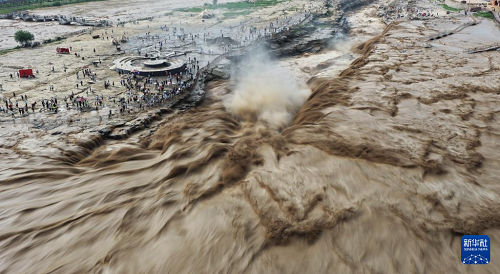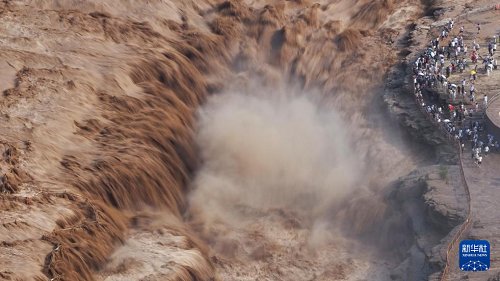 7月27日,人們在山西吉縣觀看黃河壺口瀑布(無人機照片)。(新華社發(fā) 劉宏達 攝)