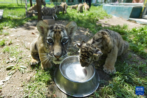 7月28日,橫道河子?xùn)|北虎林園的幼虎在飲水嬉戲。(新華社發(fā) 張春祥 攝)