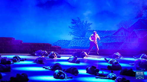 演員在貴州飯店國(guó)際會(huì)議中心表演民族歌舞劇《山河同心》(7月30日攝)。(新華社記者 陶亮 攝)