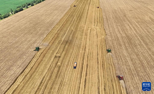 8月5日,在北大荒集團(tuán)黑龍江紅星農(nóng)場第二管理區(qū),大型收割機(jī)在搶收小麥。(新華社發(fā) 侯越 攝)