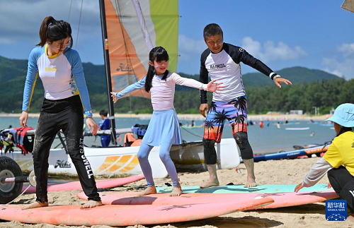 8月10日,游客在三亞市后海村附近海域沖浪。(新華社記者 郭程 攝)
