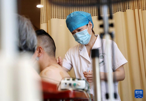 8月18日,江蘇省蘇州市姑蘇區(qū)金閶街道彩香二村社區(qū)衛(wèi)生服務(wù)站醫(yī)生為居民進(jìn)行針灸診療。(新華社發(fā) 杭興微 攝)