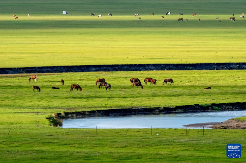 8月19日,在內(nèi)蒙古呼倫貝爾市陳巴爾虎旗,馬群在莫爾格勒河畔吃草。(新華社記者 馬金瑞 攝)