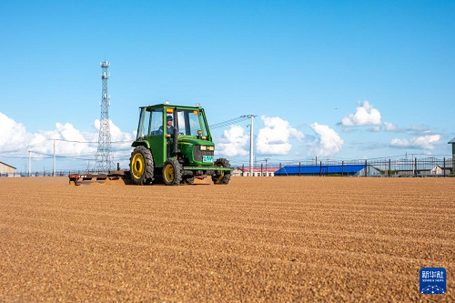 8月20日,呼倫貝爾農(nóng)墾拉布大林農(nóng)場的工人駕駛農(nóng)機翻曬小麥。(新華社記者 馬金瑞 攝)